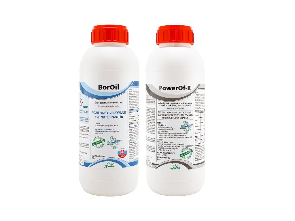 PowerOf-K a BorOil sú určené na podporu kvitnutia, zrenia plodov a zvýšenie kvality úrody vďaka doplneniu draslíka a bóru v rastline.